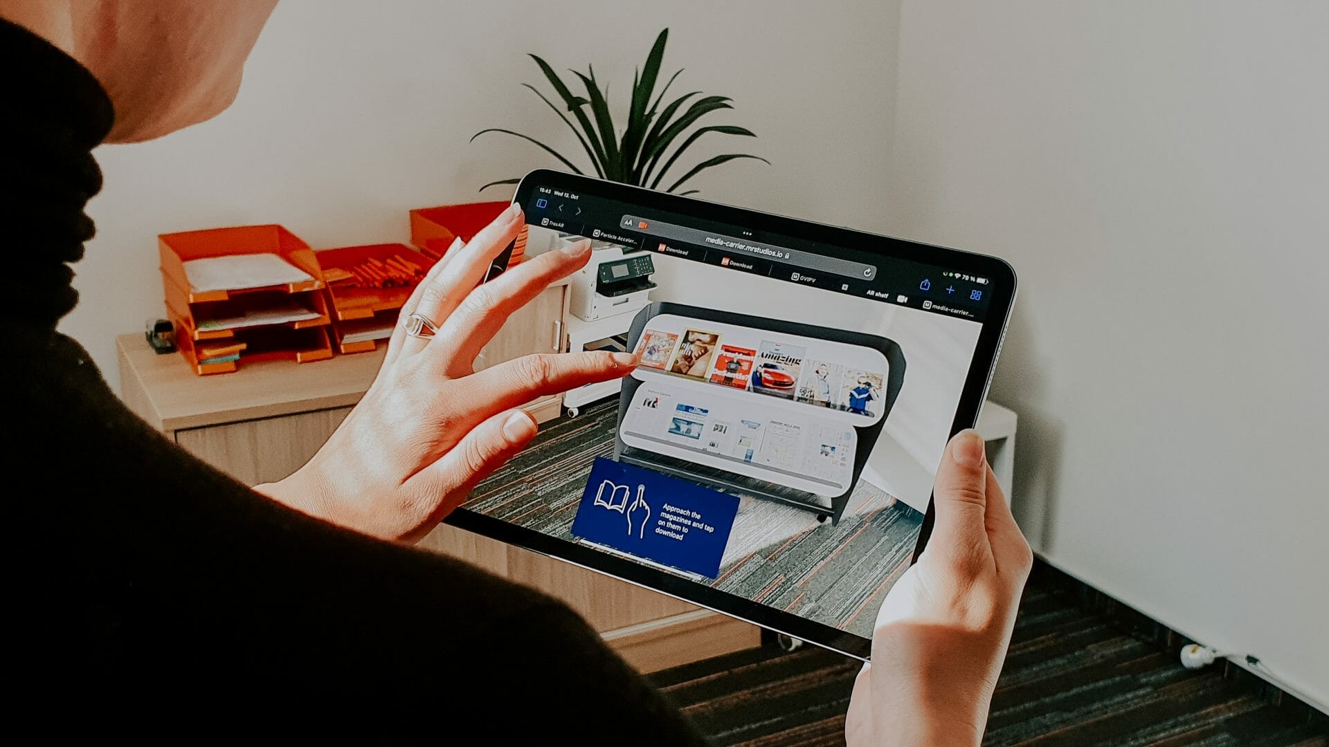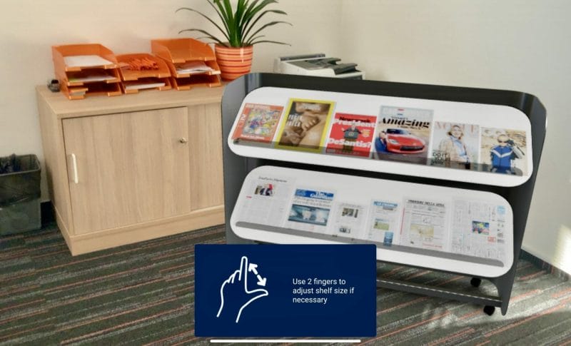 Upon opening the app on a touchscreen device, such as a mobile phone or tablet, users can place the magazine stand in their immediate surroundings using the device’s camera.
