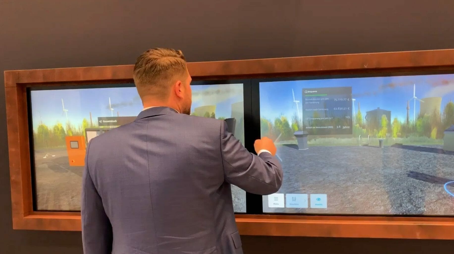 A highlight of this application is that it is used on two horizontally combined touch screens with a standalone PC. The two touch screens demonstrate the AHU before and after refurbishment, accompanied by technical data values to depict the benefits of the refurbishment procedure on existing units.