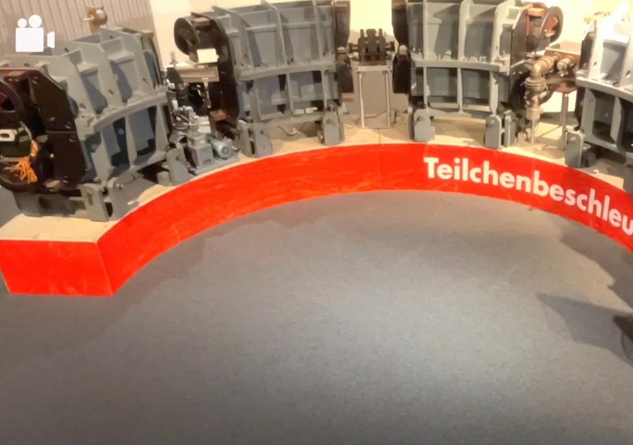 This triggers the digital AR overlays, which enhance the physical exhibition with information hotspots and a visual representation of the movement of the electron synchrotron.